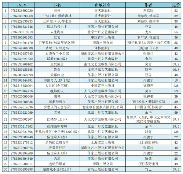 2022年5月,开卷虚构类销量前30名图书与上月变化不大,上月排名首位的《遥远的救世主》销量略有下降,《三体》三部曲重回前3名。本月有2种首次进入前30名的图书,分别是余华的《在细雨中呼喊》和4月上市的东野圭吾新书《透明的螺旋》,排名均在20名以后。