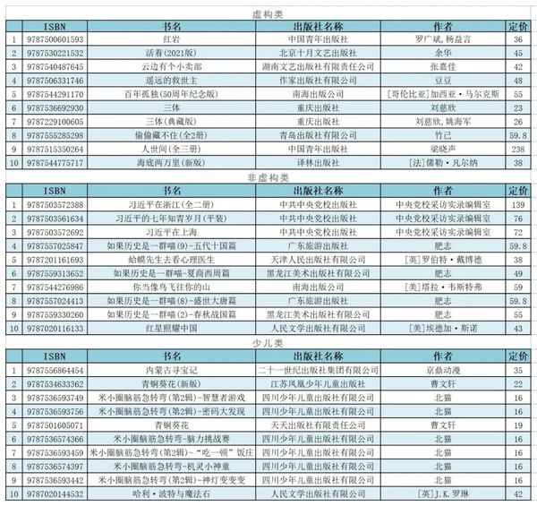 5月实体店虚构、非虚构、少儿销量前10名