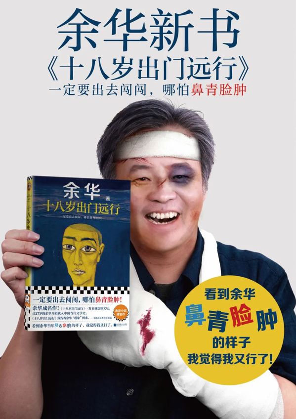 本次再版,读客文化特意制作了一张宣传图,图中的余华鼻青脸肿,缠着绷带,打着石膏,手中举着一本《十八岁出门远行》,笑容可掬。余华很喜欢这张宣传图,说这张图不仅与作品的主题“一定要出去闯闯,哪怕鼻青脸肿”相契合,“太有意思了,我自己都想买一本!我老婆也认为挺好的,我儿子是‘90后’,他也认为很好”。